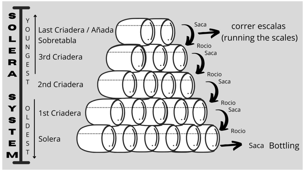 The whole process of the sacas and rocíos in a solera is called correr escalas (running the scales).