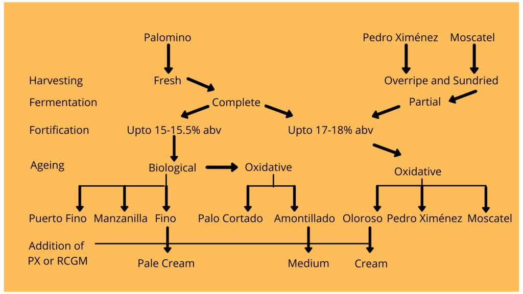 - Dried Grape Sherry: These style is produced using grapes harvested at a high level of ripeness with the sugars further concentrated by drying the grapes in the hot sun. They are produced primarily from Pedro Ximénez or Moscatel grapes.